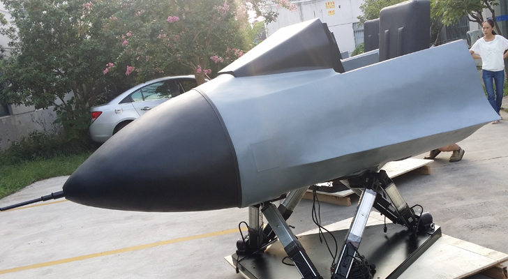 此产品外形模仿歼20造型,使用VR眼镜,模拟全景视景内容,搭配六自由度运动平台,模拟飞行中起飞、降落、紊流、巡航等状态下飞机的姿态,效果逼真。